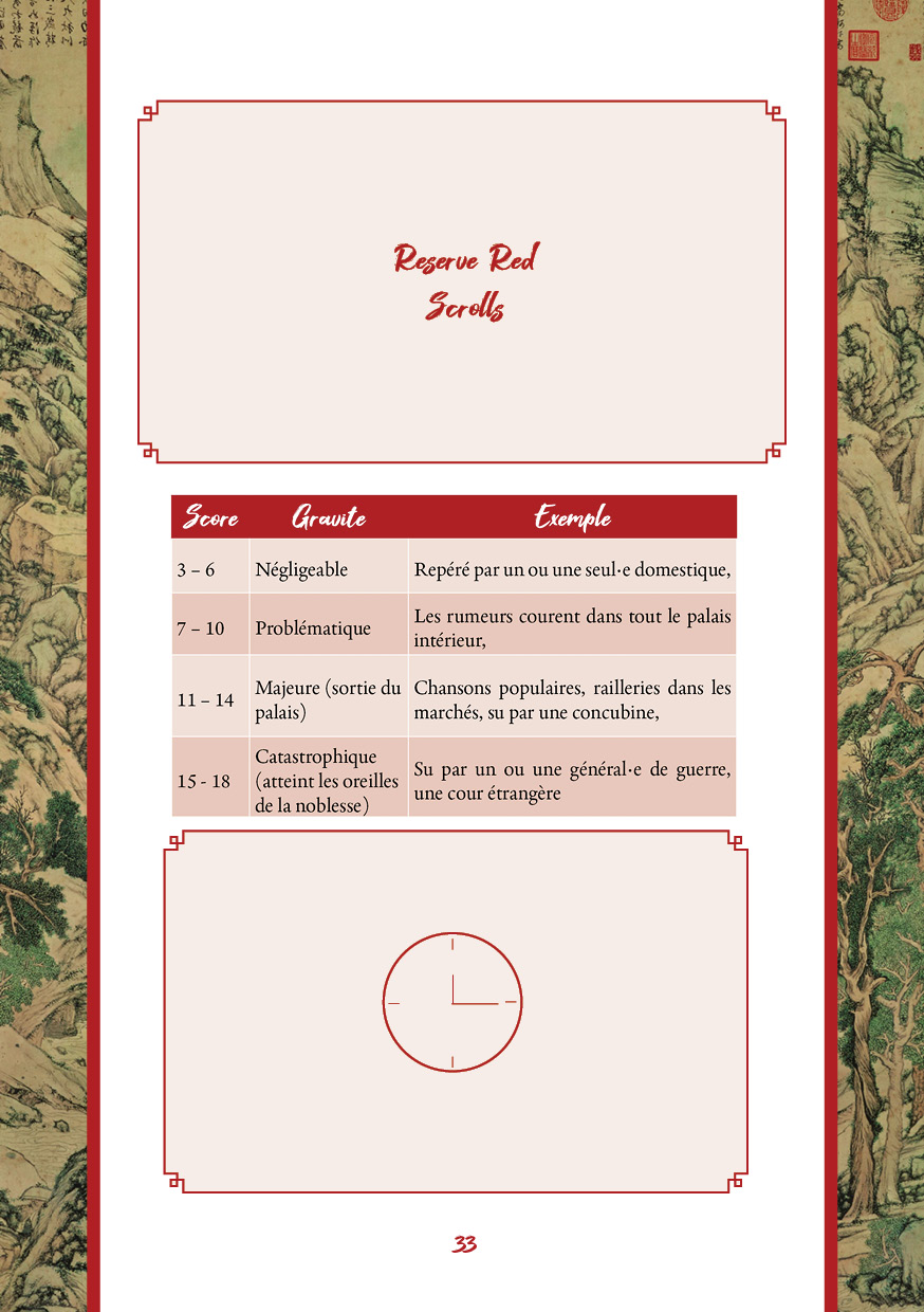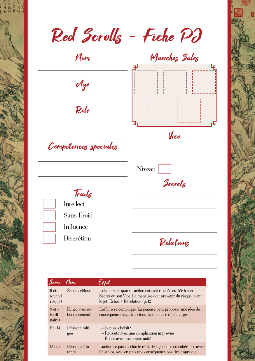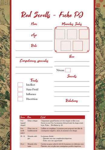 Red Scrolls est un jeu de rôle narratif à secrets émergents, avec meneuse. Jouez scandales et complots dans une Chine impériale romancée, enfermés dans l'immense et très protocolaire Cité Interdite. Vous agissez dans l’ombre dans un seul but : assurer la paix du royaume en gardant chaque personne à sa place.